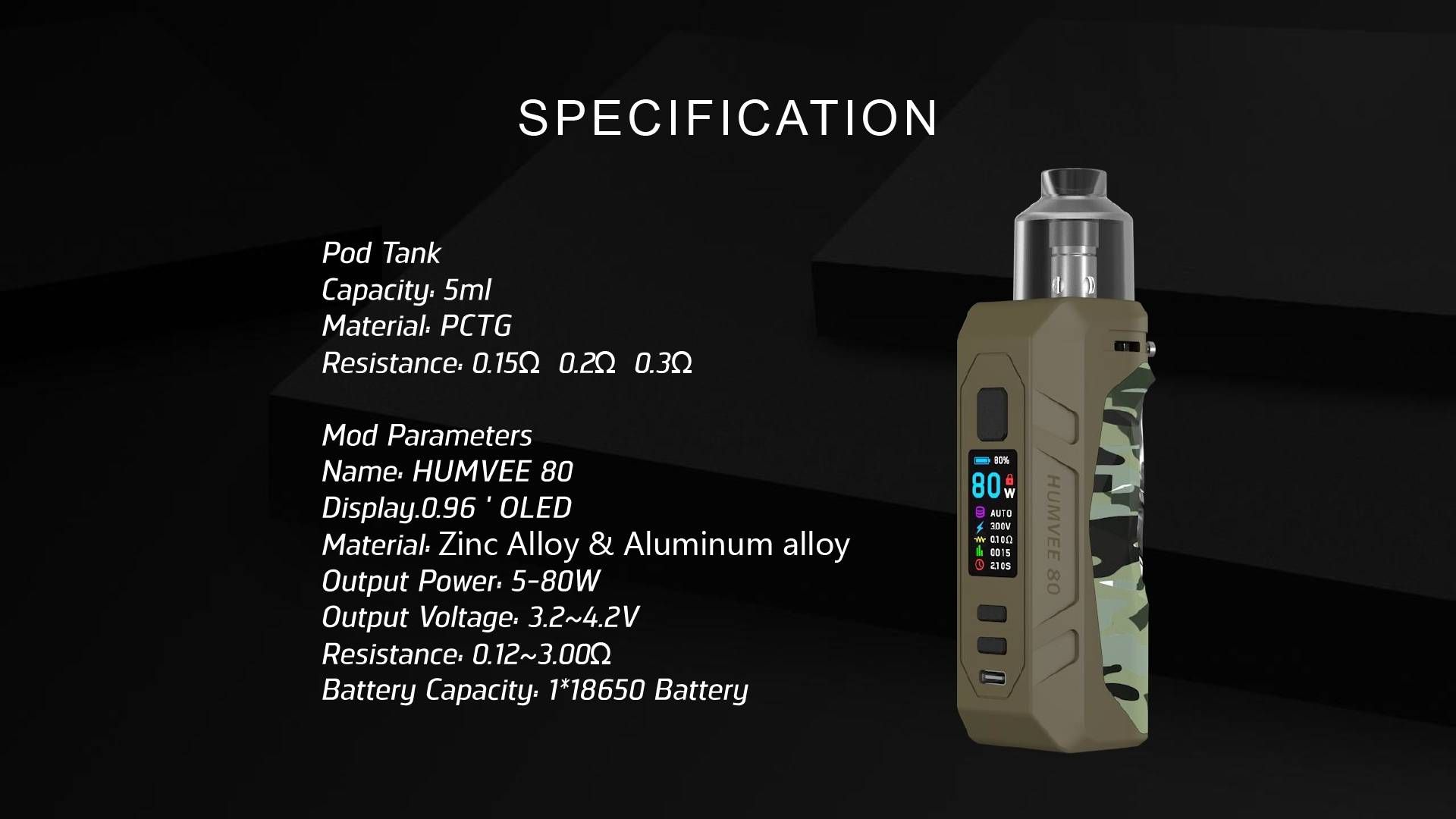 The innovative infinite airflow system of the Humvee 80 supports the regulation of any size of airway. You can get the most comfortable experience through this system no matter which kind of coil or different parameters are set. Enjoy your flavour freely!